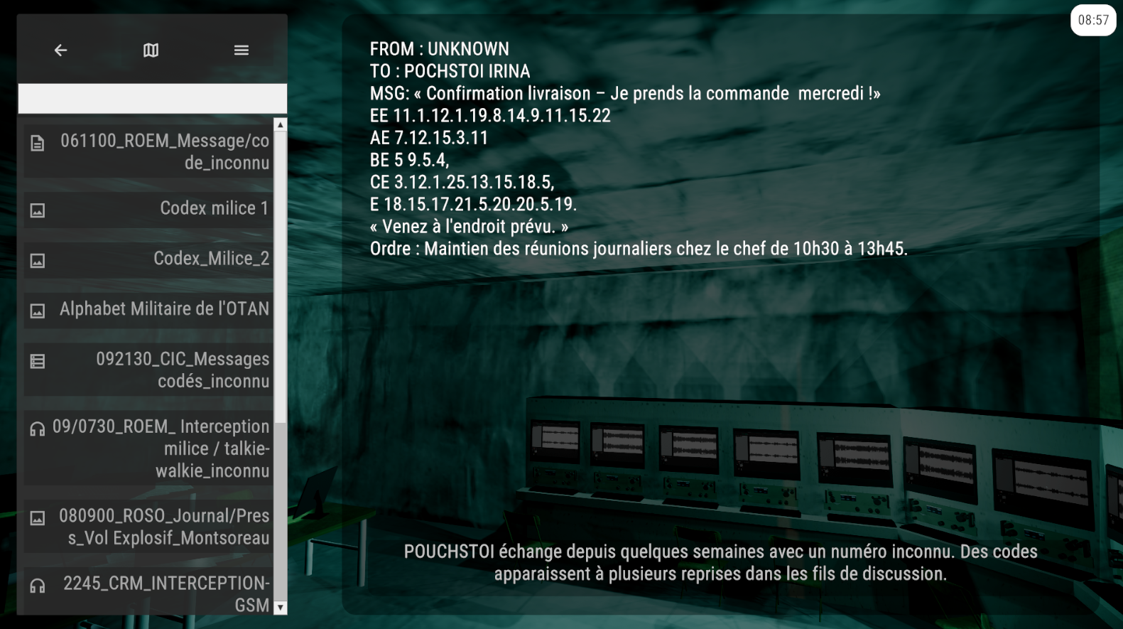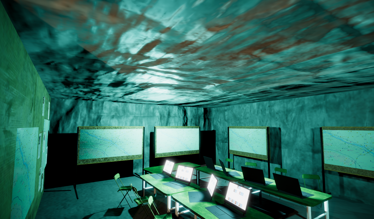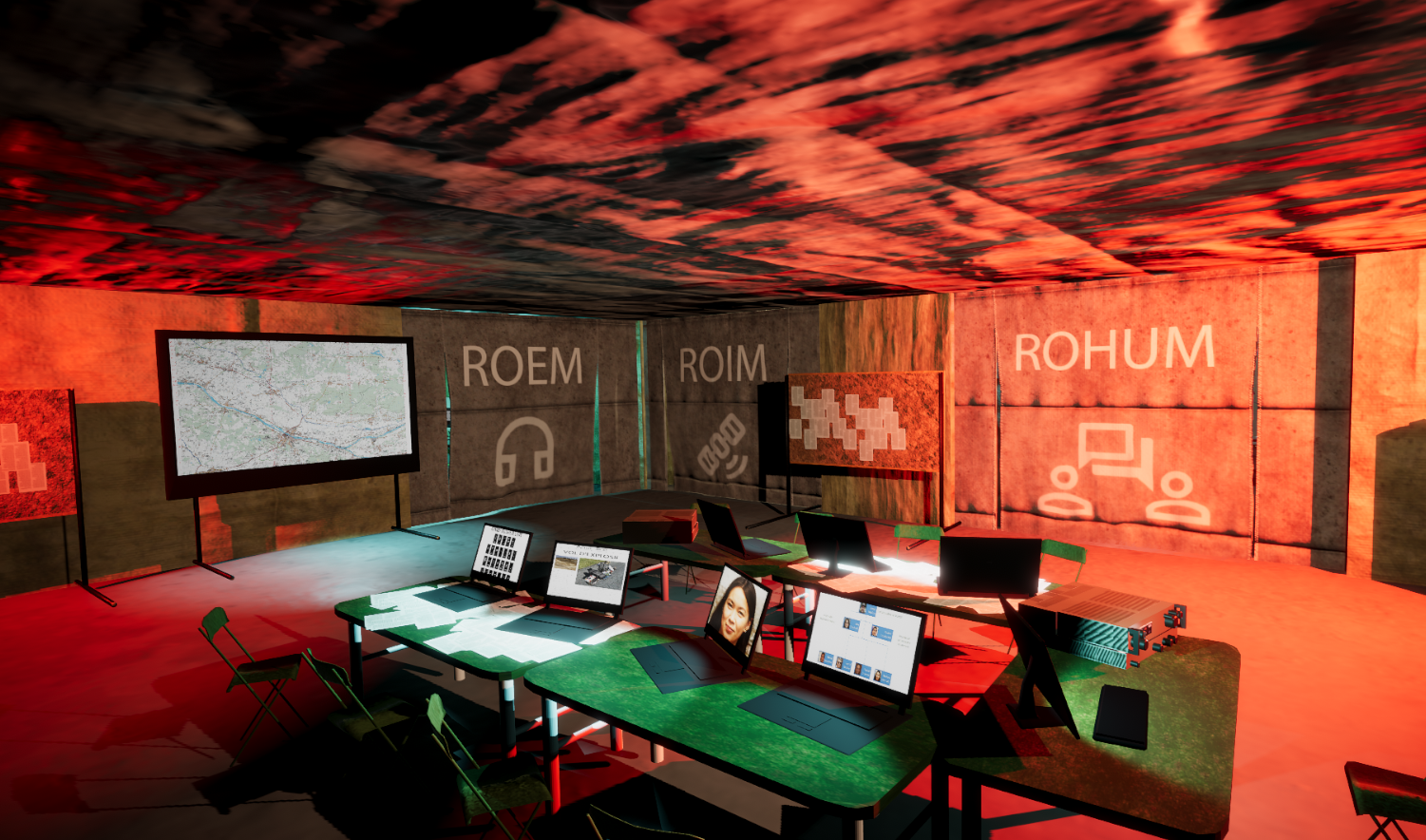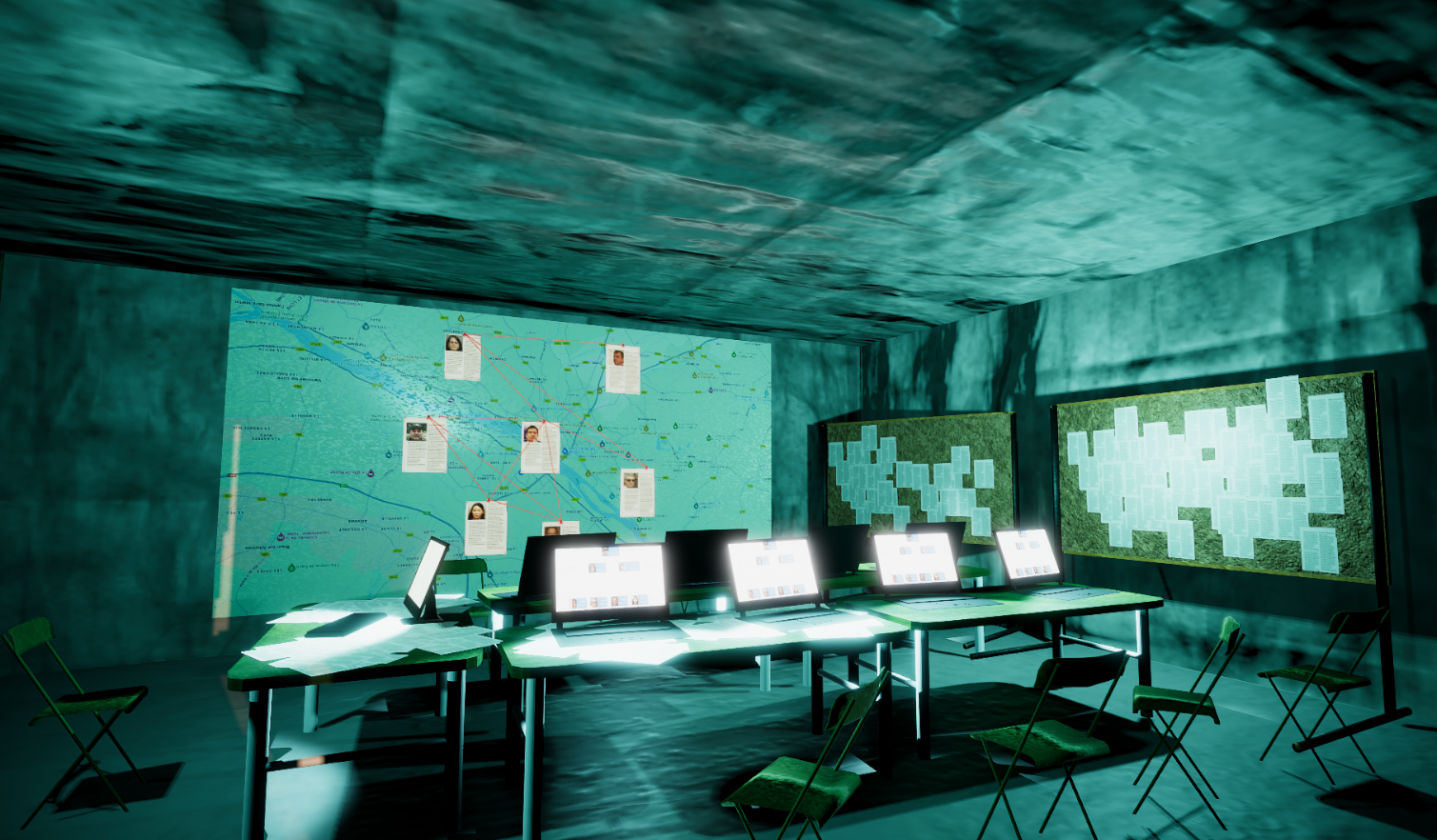 Visit a military operationnal center and process files to succeed. Five missions are available, each with 3 level of difficulty that add a few, or a LOT files to the mission. The center has 4 rooms filled with equipment, maps, and terminals to interact with.